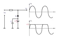 Suivant le sens de la tension E appliquée, on obtient un signal écrêté au-dessus de la masse ou au-dessous. Suivant le sens de branchement de la diode, on écrête soit l'alternance positive, soit l'alternance négative. Les sources de tension continue doivent être découplées avec un condensateur.