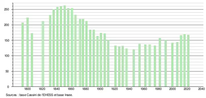 L'évolution du nombre d'habitants est connue à travers les recensements de la population effectués dans la commune depuis 1793. Pour les communes de moins de 10 000 habitants, une enquête de recensement portant sur toute la population est réalisée tous les cinq ans, les populations légales des années intermédiaires étant quant à elles estimées par interpolation ou extrapolation[21]. Pour la commune, le premier recensement exhaustif entrant dans le cadre du nouveau dispositif a été réalisé en 2006[22].