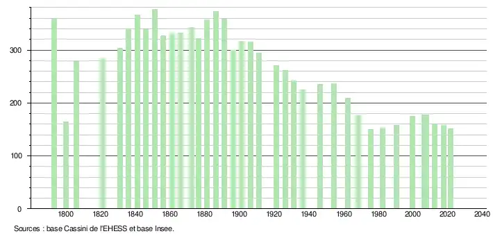 L'évolution du nombre d'habitants est connue à travers les recensements de la population effectués dans la commune depuis 1793. Pour les communes de moins de 10 000 habitants, une enquête de recensement portant sur toute la population est réalisée tous les cinq ans, les populations légales des années intermédiaires étant quant à elles estimées par interpolation ou extrapolation[19]. Pour la commune, le premier recensement exhaustif entrant dans le cadre du nouveau dispositif a été réalisé en 2007[20].