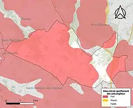 Le retrait-gonflement des sols argileux est susceptible d'engendrer des dommages importants aux bâtiments en cas d’alternance de périodes de sécheresse et de pluie. 82,1 % de la superficie communale est en aléa moyen ou fort (54,2 % au niveau départemental et 48,5 % au niveau national). Sur les 206 bâtiments dénombrés sur la commune en 2019, 93 sont en aléa moyen ou fort, soit 45 %, à comparer aux 57 % au niveau départemental et 54 % au niveau national. Une cartographie de l'exposition du territoire national au retrait gonflement des sols argileux est disponible sur le site du BRGM[16],[Carte 2].