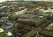 L'extérieur du bâtiment, tout en béton, est caractérisé par une enfilade de fenêtres en meurtrière[1].