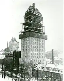La Ville, qui souhaite présenter une image moderne et progressiste, donne son accord au projet malgré les virulentes critiques selon lesquelles elle se montre incapable de protéger l'intégrité historique du Vieux-Québec[5]. Deux maisons sont démolies pour faire place au nouveau gratte-ciel. Les dates de construction du bâtiment ne sont pas claires : certaines sources donnent juin 1929 à mai 1930[4] ; d'autres, que le permis est délivré en décembre 1929, tandis que la construction commence en juin 1930[2]; parfois, on cite seulement les années: 1928-1930[6]. La pierre angulaire du bâtiment porte ces mots: "This stone was laid Oct. XXIX MCMXXIX" ("Cette pierre fut érigée le 29 octobre 1929")[7]. Toutes les sources s'accordent sur une construction rapide, qui dure moins d'un an. L'édifice est inauguré en 1931[2].