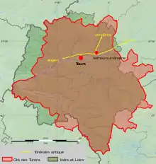 Plus tard, c'est probablement une agglomération secondaire dès l'Antiquité[3] ; la grande voie antique qui, de Cenabum (Orléans) à l'est à Caesarodunum (Tours) puis Juliomagus (Angers) à l'ouest, longe la Loire sur sa rive droite passe à proximité — elle apparaît sur la table de Peutinger — ; à Vernou s'embranche une autre voie antique qui longe la Brenne et se dirige vers le nord et Vendôme[4].