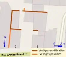 En 1983, le parement des murs et la partie supérieure de plusieurs arcades sont encore visibles dans un grenier[17]. La base des murs ouest et nord est également préservée au rez-de-chaussée du même bâtiment, mais elle est recouverte d'un enduit[18]. Une partie du mur méridional existe encore, dépassant d'une habitation moderne et montrant le départ d'un arc. Enfin, selon Josette-Hélène Vagnini-Plot le mur orienté nord-sud qui sépare les numéros 5 et 7 de la rue Aristide-Briand pourrait appartenir au bâtiment[18].