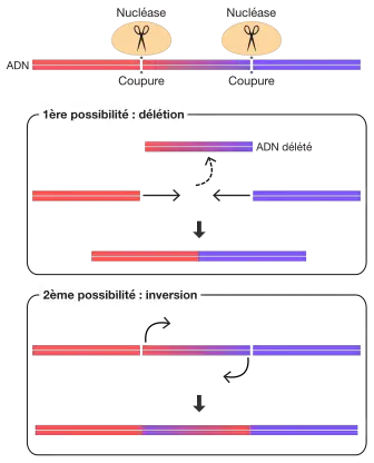 Le processus de jonction d'extrémités non homologues peut également être utilisé afin de générer des délétions ou inversions de segments d'ADN. Dans ce cas, deux nucléases coupant de part et d'autre d'un fragment d'ADN sont utilisées. Cela donne lieu à deux événements possibles de réparation : une perte (délétion) de l'ADN excisé ou une inversion de l'ADN suivie d'une re-ligation.