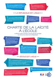 Depuis la circulaire du , il est obligatoire pour les établissements scolaires d'afficher la charte de la laïcité à l'école de façon à être visible de tous[15].