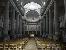 Bien que doté de transepts peu débordants, le corps de l'édifice affecte un parti basilical, huit colonnes de style toscan rythmant la nef centrale accostée de deux bas-côtés. La croisée du transept, couronnée d'une coupole sur tambour, débouche sur un chœur en hémicycle, deux chapelles de plan carré prolongeant les collatéraux de part et d'autre. Clocher et sacristie, à l'arrière du chœur, occupent un emplacement typique du XVIIe et du XVIIIe siècle[6].