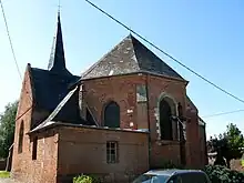 Un clocher à base quadrangulaire domine la première travée de la nef. Il est terminé par une flèche couverte d'ardoise. Un transept et un chœur en abside prolongent la nef.