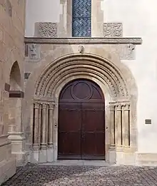 - La porte de la sacristie, et le "sourire de Rouffach" : porte à coussinets sculptés de chapiteaux, surmontée d'un arc brisé dont le tympan présente un Agneau pascal. Les chapiteaux sont ornés de feuillages et de deux élégantes têtes en haut relief appelées sourire de Rouffach[21].