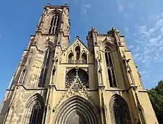 La façade ouest de Notre-Dame, "une réplique évidente de celle de la cathédrale de Strasbourg" pour Hans Rheinhardt, contribue largement au caractère majestueux de l'église, mais le massif occidental a été construit en plusieurs étapes. Les ajouts du XIXe siècle se distinguent par le grès rose des éléments construits au XIVe siècle en grès jaune de Rouffach. Le portail principal aux voussures vides (voir paragraphe suivant) est surmonté d'un haut gâble triangulaire ajouré dont le fleuron monte jusque devant la remarquable rosace de Rouffach qui compte vingt pétales. À l'étage supérieur, sous le pignon triangulaire, une galerie formée de trois ogives de style gothique flamboyant soutenues par des colonnettes, complète élégamment la partie centrale la façade. Le décor statuaire est très abîmé, cependant deux anges décapités sont attribués à Woelflin de Rouffach qui est mentionné avec Johann Behem comme maître d'œuvre de cette façade[8]. À l'issue de cette campagne de construction, l'amorce de la tour nord ne dépassait pas le premier niveau tandis que la tour sud, qui atteignait à peu près sa hauteur actuelle, était surmontée d'une flèche torsadée comme le suggèrent des représentations ou photographies anciennes de l'église[9].