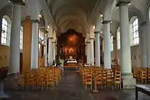 Intérieur d'inspiration classique, voûté en voile. Nef rythmée par les arcades en plein cintre sur colonnes toscanes; pilastres engagés entre les fenêtres dans les collatéraux[3].