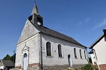 L'édifice est construit en craie et recouvert d'ardoise des matériaux provenant du château d’Hyerville. Il se compose d'une nef unique et d'un chœur terminé en abside arrondie. Un clocher avec un toit en pointe recouvert d'ardoises surmonte l'entrée. Le bâtiment est en partie construit au-dessus d'une muche.