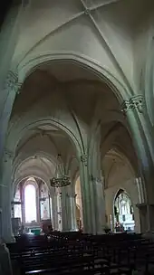 L'église à trois nefs commencée à la fin du XIIe siècle a conservé des traces de l'influence romane : socle massif des piles avec des colonnes engagées, couronnées de chapiteaux ; éclairage naturel du chœur ; les chapelles encadrant le chœur et les fenêtres originelles de l'église s'ouvrent en arc en plein cintre ; les contreforts des murs extérieurs.