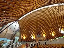 La charpente apparente est en bois lamellé-collé, formée de 1300 losanges et conçue par l'ingénieur Robert Lourdin, spécialiste de ce matériau. Deux poutres, elles aussi en lamellé-collé, forment la voûte qui culmine à 20 mètres de haut.