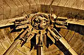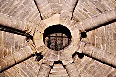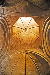 Supportée par les puissants arcs de décharge latéraux d'où s'élancent les trompes, cette coupole est ornée de huit nervures de pierre convergeant vers un oculus.