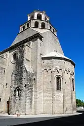 La partie supérieure du chevet est ornée d'arcades cintrées à triple voussure qui retombent alternativement sur les chapiteaux des pilastres et sur des modillons à décor anthropomorphe ou géométrique.