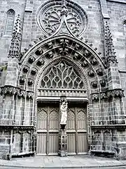 Le portail de l'église présente une copie de la statue de la Vierge Marie nommée La Vierge à l'oiseau. La statue de la Vierge à l'oiseau qui était située sur le trumeau du porche occidental de l'église sur un piédestal à écusson bûché pendant la Révolution, le 27 brumaire an II a été déplacée à l'intérieur de l'église sur un autel construit à cet effet en 1933. Elle est datée du début du XVe siècle, d'après une étude de 1997. Le sculpteur serait Pierre de Thury, d'après Heyraud qui aurait travaillé pour le duc Jean de Berry lors de travaux à l'église Notre-Dame-du-Marthuret entre 1410 et 1415.
