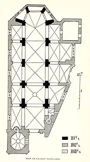 L'église comprend un nef de quatre travées avec des bas-côtés, dénuée de transept, terminée par un chevet à pans coupés, avec des chapelles disposées autour de l'abside et le long du collatéral sud, mais la voirie leur a donné un plan irrégulier.