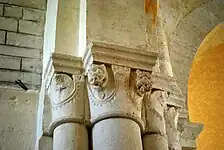 Les chapiteaux du rez-de-chaussée : Parmi les huit chapiteaux, seulement deux sont authentiquement romans : celui au nord, qui est trop dégradé pour être interprété, et le grand chapiteau, à gauche de la porte centrale. Les six autres chapiteaux sont des pastiches du XIXe siècle datant de la restauration de 1860.