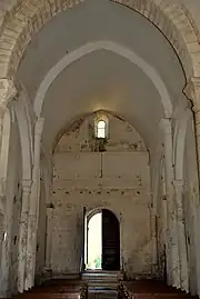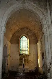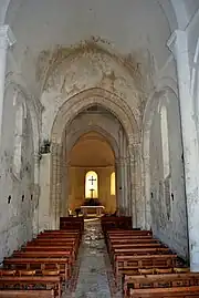 La nef, où l'on descend par six marches, est divisée en deux travées séparées par des colonnes engagées auxquelles sont accolées des colonnes plus basses qui soutiennent des arcs latéraux. Ils prennent appui sur de hautes colonnes à demi engagées dans les maçonneries des murs. Ces colonnes sont flanquées, en parties basses, par des colonnes supportant les arcs formerets visibles à l'extérieur. Chacun des arcs encadre une fenêtre romane, longue et très étroite, sur l'extérieur comme à l'intérieur.