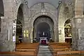 L’édifice est couvert de charpente. Il se compose d’une nef à trois vaisseaux (XVIIIe siècle) séparés par des arcs de plein cintre portés par des piles carrées, d’un transept et d’un chœur romans (XI-XIIe siècle). La croisée du transept s’ouvre par de grands arcs de plein cintre à double rouleau portés par des piles complexes à colonnes engagées dont les chapiteaux sont sculptés[6]. Elle est couverte d’un plafond de bois. Le chœur de deux travées séparées par un arc doubleau retombant sur des colonnes engagées à chapiteaux sculptés est voûté en berceau. Il s’achève en cul-de-four[1],[6].