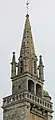Le clocher, de type "Beaumanoir", est composée d'une seule galerie classique, ainsi que d'une flèche accostée de quatre clochetons d'angle ; il surmonte la façade ouest, flanquée de contreforts et de lanternons Renaissance, et est accosté d'une tourelle d'escalier cylindrique, au nord[2],[3].