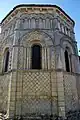 L'abside demi-circulaire, séparée du chœur par un arc posé sur deux colonnes à chapiteaux, plafonnée en cul-de-four est éclairée par cinq fenêtres en plein-cintre. Des colonnes montant du sol les séparent. La partie haute des colonnes est brisée en zigzag et elles semblent céder sous un poids qui les accable. Les colonnes sont terminées par des chapiteaux, sculptés de feuilles d'acanthe, sur lesquels viennent s'appuyer des arcs surbaissés. Chaque angle des fenêtres est garni d'une colonnette.