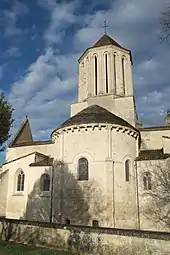 Le sanctuaire contraste par sa richesse avec la sobriété extérieure de l'abside. Ses baies à colonnettes s'ouvrent dans une ample arcature dont les tailloirs des chapiteaux se prolongent en une frise très fouillée.