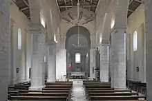 Trois nefs sont séparées par des piliers rectangulaires aux angles abattus et sont composées de quatre travées qui, depuis les XVe – XVIe siècles, remplacent les six travées de style roman d'origine correspondant aux fenêtres latérales.