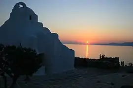 Plus ancienne des 400 églises de Mykonos, l'église de la Panagía Paraportianí est construite entre 1425 et le XVIIe siècle, au bord de la mer Égée, au bout du vieux port du quartier Kástro de la ville de Chóra (capitale de l’île).