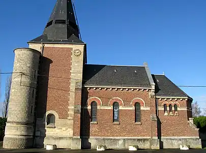 L'édifice est construit en brique et pierre. L'église proprement dite est précédée par une massive tour-clocher dont la façade est en pierre. Percé d'un porche surmonté d'une grande rosace incluant une croix, il se termine par un toit en flèche couverte d'ardoises. La tourelle d'escalier qui flanque le clocher côté sud, est plate au sommet. La nef est légèrement plus élevée et plus large que le chœur. Le mur extérieur de la nef est décoré dans sa partie supérieure d'un motif en damier obtenu par l'assemblage de trois briques