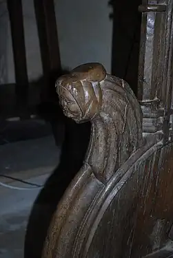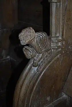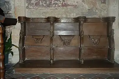 La miséricorde médiane, côté sud, est absente, un escabeau à l'usage de l'officiant en occupe la place.