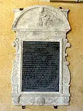 - La plaque de fondation de Charles Lamette, curé d'Arthies pendant cinquante-quatre ans, est en marbre, et mesure 100 cm de hauteur pour 67 cm de largeur. Elle possède un encadrement décoratif, avec deux pilastres sous la forme de volutes baroques ; un fronton cintré où le défunt est représenté agenouillé devant un prie-Dieu ; et un soubassement, où un cœur ailé est flanqué de deux paires de tibias croisés. Par son testament résumé dans l'inscription de lettres dorées d'un centimètre de hauteur, le prêtre fonde une messe à célébrer chaque année le jour anniversaire de son décès, le . En contrepartie, il laisse douze arpents de terre à sa paroisse, mais aussi la somme importante de 42 000 livres au couvent des Cordeliers de Mantes. Charles Lamette est enterré dans l'église des Cordeliers[39].