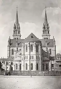 L'église, longue de 87 mètres et large de 37 mètres au transept, possède deux clochers identiques de 68 mètres de haut, soit d'une taille pratiquement équivalente à celles des tours de Notre-Dame. Les flèches octogonales sont flanquées de quatre pinacles et sont terminées par une croix en fer surmontée d'une girouette en forme de coq.