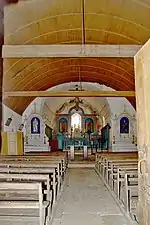 On accède à la nef unique par un narthex éclairé à droite par deux baies géminées en plein cintre. Cette nef recouverte de laves dont plafond de bois est en coque de bateau inversé n'est éclairée qu'à droite par quatre fenêtres hautes, étroites et cintrées. Le chœur, voûté en plein cintre et surplombé d'un clocher-campanile à double arcade protégé par un toit de merrain, est éclairé par une fenêtre à linteau triangulaire.