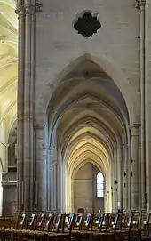 L'intérieur de l'église paraît d'une grande homogénéité stylistique et appartient en majeure partie au style gothique flamboyant, sauf les deux dernières travées de la nef et du transept qui conservent des traces du XIIIe siècle. Les fenêtres laissent également apparaître une certaine diversité stylistique et traduisent ainsi l'histoire de l'édifice. Par contre, la corniche fortement saillant le long des murs hauts de la nef, évoquant une esquisse d'entablement et donc le style de la Renaissance, est en plâtre et tout à fait moderne. Une caractéristique commune à toutes les parties flamboyantes de l'église est l'absence de chapiteaux. Les nervures des voûtes sont pénétrantes et se fondent dans les supports fasciculés. Dans la nef et les bas-côtés, toutes les voûtes sont des croisées d'ogives simples en arc brisé, et les grandes arcades sont également en arc brisé. Les voûtes des cinquième et sixième travées ont été refaite à la même période que les autres, à la période flamboyante. Dans le chœur, ses collatéraux et le déambulatoire, les arcades et voûtes sont en cintre surbaissé[15].