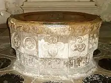 - Les fonts baptismaux du XIIIe siècle sont en pierre calcaire, et se présentent sous la forme d'une grande cuve baptismale à infusion de plan ovale reposant sur un pied. Sous la bordure court une frise de feuilles grasses alternant avec des fruits d'arum. En dessous, la cuve est structurée en quatorze panneaux, soit un vers chaque point cardinal, et deux panneaux obliques de part et d'autre du panneau central des faces nord et sud. Chaque panneau arbore en son centre un médaillon sous la forme d'un cercle, d'un trilobe, d'un quatre-feuilles, ou d'un pentalobe, qui contient une rosace ou des feuillages, et dans un seul cas, un bucrane (ce ne devrait pas être le bœuf de saint Luc, puisque les autres symboles du Tétramorphe manquent). Cet élément évoque la Renaissance, et il en va de même de la frise de glyphes qui occupe les deux tiers supérieurs du pied, à moins que ce ne soient des arcatures plaquées. En bas, le pied possède une base au profil d'un cavet et d'une plate-bande. Louis Régnier signale que les fonts de Vétheuil sont pratiquement identiques[11],[16].