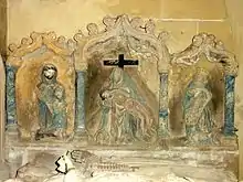 - Le bas-relief représentant la Dormition de la Vierge Marie était en bois polychrome, et datait du XVIe siècle. L'encadrement était de style Renaissance. Les Douze Apôtres entourant la Vierge sur son lit de mort occupaient presque toute la superficie. Au premier plan, l'on voyait deux figures de donateurs agenouillés devant un purpitre. Cette œuvre classée depuis a disparu depuis. Elle n'est déjà plus signalée par Louis Régnier[30] (sans illustration).