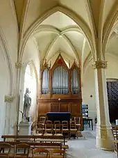 - La partie instrumentale de l'orgue, qui est placé sur une estrade au début de la nef sud (et non sur une tribune), date de 1843 / 1844, et a été confectionnée par le facteur d'orgue John Abbey, de Versailles. L'instrument a été modifié plusieurs fois, notamment en 1954, au titre des dommages de guerre. La console, retournée face à la nef, ne comporte qu'un seul clavier manuel de six jeux, et un pédalier à deux jeux. Le buffet d'orgue est de style néo-gothique, à trois plates faces surmontées de gâbles tréflées et ornées de crochets. Il fut réalisé en 1844 par Girard, menuisier à Limay, et agrandi en 1850. Entre 1857 et 1901, l'orgue était placé dans le chœur. Seule la partie instrumentale est classée au titre objet, et ceci, depuis août 1986[28]. La restauration de l'orgue devenant nécessaire, il fut démonté en 2007 pour rejoindre les ateliers du facteur d'orgues Claude Berger, à Clermont-l'Hérault. Ce dernier entreprit une restauration total, consistant en la réparation du buffet, la réalisation d'un sommier de pédale et la reconstitution de jeux disparus (sans illustration).