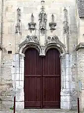 Chacun des piédroits est flanqué, de l'intérieur vers l'extérieur, d'un pilastre, de deux grêles colonnettes du même diamètre que sur les réseaux des fenêtres, de deux fines colonnettes, et d'un mince contrefort se présentant par un angle saillant. Ces contreforts sont flamboyants, et fournissent le prétexte aux clochetons plaqués très effilés qui entrent dans la composition du décor des parties hautes du portail. Les pilastres et colonnettes portent des chapiteaux-tuyaux sculptés de crochets maigres mais bien fouillés, et munis de tailloirs octogonaux profilés d'un tore et d'un cavet. Au lieu d'admettre que le portail fut réalisé après l'achèvement de la nef, dont Régnier date les deux dernières travées de la fin du XIIIe siècle malgré leur caractère nettement moins avancé, et de supposer que les deux premières travées furent rebâties après les dommages subis sous la guerre de Cent Ans, l'auteur avance l'hypothèse que les colonnettes auraient été rapportées. Elles proviendraient de l'église du couvent des Célestins de Limay ou de l'église Saint-Maclou de Mantes. Du coup, Régnier date les colonnettes de la fin du XIVe siècle[11], époque qui n'a pratiquement laissé aucune trace dans l'architecture religieuse de la région, mais qui voit en principe la transition du style rayonnant vers le style flamboyant, ce qui ne se reflète pas dans la facture des colonnettes. S'il y a question de deux archivoltes, c'est que les deux portes en anse de panier sont surmontées chacune de sa propre archivolte, comme sur le portail latéral sud de Triel-sur-Seine. Elles retombent au milieu sur un cul-de-lampe sous la forme d'un court fût polygonal, dont les faces sont séparées par des arêtes, et sculptées de motifs végétaux, et qui est surmontée d'une console pareillement sculptée. Cette console fait partie de la niche à statue aujourd'hui vide qui est creusée dans le mur, et qui est surtout remarquable pour son dais architecturé finement ciselé encore purement flamboyant. Des oves sont bien présentes sur un chapiteau à l'intérieur, mais la Renaissance ne se manifeste par aucun détail sur le portail. Les archivoltes se composent de deux profondes voussures, qui sont délimitées par des arêtes saillantes. La voussure supérieure accueille une frise de pampres qui n'est aujourd'hui plus complète. Chaque archivolte est surmontée d'une accolade, dont le centre est sculpté de l'habituelle rosace de trois feuilles de chou frisées, dont les flancs sont garnis de crochets, et dont le couronnement est formé par un clocheton plaqué également accompagné de feuilles frisées[12]. L'on a donc, en haut du portail, la juxtaposition de cinq formes élancées, soit les clochetons plaqués des contreforts, les clochetons encore plus fins des accolades, et la niche à statue avec son dais.