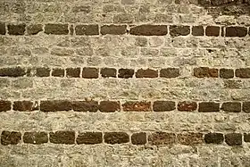 L'appareil alterné blanc et brun du chevet se prolonge partiellement sur les murs des collatéraux avant de céder la place à la maçonnerie du XXe siècle.