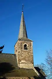 Dominant le chevet, l'église conserve un clocher roman présentant une maçonnerie faite principalement de moellons de grès ferrugineux assemblés en appareil irrégulier et parsemée de blocs de grès blanc, sauf la base qui est uniformément blanche.