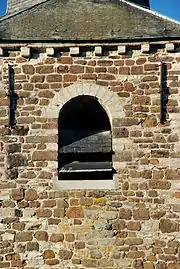 Chacune des faces du clocher est percée au dernier niveau d'une baie campanaire à abat-son, surmontée d'un arc en plein cintre aux claveaux de pierre calcaire et flanquée de deux ancres de façade.