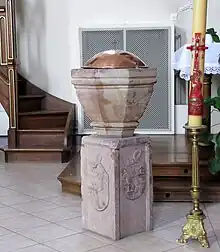 Les fonts baptismaux sont composés de deux parties réalisées à des dates différentes. Le socle est un ancien tronc de quête datant des environs de 1475. Ayant la forme d’un simple parallélépipède, il porte sur ses flancs les armoiries de l’évêque Robert de Bavière et un autre blason non identifié, probablement celui d’un bienfaiteur. La cuve porte la date de 1694 et une inscription identifiant le commanditaire comme étant le curé de l’époque, Jean Jacques Blisch. Une autre inscription presque illisible mentionne un schultheiss et une troisième évoque le caractère sacré du baptême[34],[11].