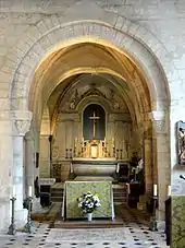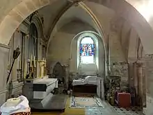 La seconde travée du chœur Saint-Denis se substitue à la seconde travée du chœur roman, qui, comme l'ont avéré des sondages archéologiques lors de la restauration en 1971, était en hémicycle et allait jusqu'aux marches de l'ancien maître-maître-autel. Il était aussi large que le chœur actuel, et les pans de mur près de l'arcade vers la base du clocher proviennent apparemment du chœur roman. Au sud, un décrochement très net existe entre le mur roman et le mur de la seconde moitié du XIIIe siècle, et sans doute pour éviter d'encombrer le chœur, les colonnettes des ogives ont été placées après ces pans anciens, devant lesquels elles ne font pas saillie. Ces colonnettes datent vraisemblablement d'une reprise en sous-œuvre à la fin du XVIe siècle, dans le contexte de la construction du caveau. Celle du nord a été mutilée et la restauration n'a pas été menée à terme, pas plus qu'au sud où le parement du mur manque en partie. Les colonnettes ont été carrément supprimées côté est, de part et d'autre du mur du chevet, sans doute pour la pose des boiseries. De la fin du XVIe siècle date aussi la fenêtre côté sud, qui est en plein cintre et s'inscrit dans un arc de décharge qui fait un peu saillie devant le mur, dont Julie Aycard et Pierrette Bonnet-Laborderie supposent qu'il a également été refait à la même occasion. L'on note une grande piscine liturgique à gauche de la fenêtre. La voûte d'ogives subsiste toutefois de la seconde moitié du XIIIe siècle, et son profil d'un tore en forme d'amande séparé d'un bandeau par deux gorges est de type gothique. Le mince filet au milieu du tore est toutefois inhabituel. La clé de voûte est un disque présentant une fleur à huit pétales festonnées. Les deux travées du chœur Saint-Jean-Baptiste sont voûtées de la même façon et datent de la même époque : ces travaux étaient motivés par l'arrivée des reliques, et l'on peut penser que par la reconstruction du chœur, le seigneur (qu'aucun auteur ne cite nommément) voulait aussi exprimer sa gratitude envers Dieu pour être revenu sain et sauf de Croisade[24],[23].