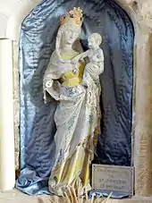 - Une statue en pierre polychrome fortement mutilée, sans tête ni mains, est placée sous la première arcature du collatéral nord.