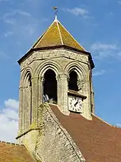 Le clocher appartient à la famille des clochers octogonaux du Beauvaisis et du Vexin français du XIIe siècle, dont il représente sans doute le plus jeune membre. Édifié vers 1200, il est contemporain de la chapelle latérale nord du chœur, et n'a plus rien de roman. Les autres clochers du même type sont Brueil-en-Vexin, Condécourt, Jambville, Rieux (aujourd'hui mutilé), avec un seul étage ; Bouconvillers, Cambronne-lès-Clermont, Cauvigny, Lierville, Tracy-le-Val (en dehors du périmètre signalé), avec deux étages ; et Acy-en-Multien (en dehors du périmètre signalé), avec trois étages. La question si le clocher compte un ou deux étages n'est pas évidente à trancher : au nord, où le toit en bâtière du croisillon conserve son niveau d'origine, on aperçoit la courte section où s'opère, moyennant des glacis aux angles, le passage du plan carré vers le plan octogonal. Cette section est bâtie en moellons et dépourvue de fenêtres. Elle se termine par un bandeau biseauté, sur lequel prennent appui les huit piliers qui cantonnent les baies en tiers-point, et qui supportaient initialement une flèche de pierre. Les baies sont flanquées de pilastres plats, qui supportent une première archivolte non moulurée et simplement chanfreinée. Au niveau des impostes, les pilastres sont agrémentés de chapiteaux de crochets de plan rectangulaire. Ils sont assortis aux chapiteaux des deux paires de fines colonnettes appareillées, qui supportent les deux autres archivoltes. Seule l'archivolte supérieure est moulurée d'un tore. Aux colonnettes des fenêtres, s'ajoutent des colonnettes supplémentaires qui ornent les angles de l'étage. Le décor est complété par des cordons de têtes de clous au-dessus des fenêtres, qui vont d'un angle à l'autre. Les murs se terminent par une corniche beauvaisine très plate, et sans modillons ou autres éléments sculptés. Elle devrait marquer l'extrême fin de l'emploi de la corniche beauvaisine dans la région[13].