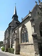 La construction du chœur actuel est imputable à l'incendie ayant détruit son prédécesseur en 1422. L'on sait par une charte ancienne que l'église a été consacrée de nouveau en 1479, mais cette date ne peut correspondre à l'achèvement du chœur actuel ; il doit s'agir d'une réparation sommaire de l'ancien chœur. D'après l'analyse stylistique, les travaux pour le nouveau chœur auraient commencé pendant le premier quart du XVIe siècle dans le style gothique flamboyant, pour se terminer vers la fin du siècle seulement dans le style de la Renaissance, s'imposant de plus en plus dans la région peu avant le milieu du XVIe siècle. L'abside et la dernière travée du chœur se caractérisent par des contreforts scandés par deux niveaux de larmiers, puis par une retraite moyennant un chaperon, dont le gâble est pourvu d'un décor flamboyant, suggérant un petit clocheton. Puis la partie supérieure du contrefort présente deux pans obliques décorés de clochetons plaqués. Une gargouille fait saillie au-dessus, et l'ensemble est couronné d'un pinacle garni de crochets. Les murs se terminent par une frise de feuillages, et à la naissance du toit, une balustrade à jour relie les pinacles. Son motif sont des quadrilobes allongés, subdivisés par un meneau vertical. Il est intéressant d'observer que l'ordonnancement reste analogue pour la seconde et la première travée, et que seul le motif de la frise change pour s'adapter au goût de la Renaissance : Les feuillages cèdent la place à des oves, puis à des denticules. — Les deux chapelles du sud sont à peu près contemporaines des travées adjacentes du chœur et de style purement flamboyant, alors que le collatéral nord a été ajouté après l'achèvement du chœur et affiche le style de la Renaissance. Ce collatéral est couvert d'un toit en bâtière dans son axe, alors que les deux chapelles sont couvertes d'un toit en appentis s'appuyant contre le mur du chœur. Le pignon du côté du chevet ne reflète pas cette réalité[2].