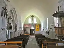 À l'intérieur, la nef est recouverte d'une fausse voûte en berceau de bois et plâtre légèrement brisé, et la décoration fait entièrement défaut. La disproportion de la nef avec le chœur est flagrante, tant sur le plan de la hauteur que sur le plan de la longueur. Comme pour d'autres églises dans le même cas, ce constat est généralement expliqué par la répartition des frais de construction et des charges d'entretien entre les gros décimateurs pour les parties orientales, et les paroissiens pour la nef, et, le cas échéant, pour le clocher. Souvent les paroissiens ne parvenait pas à réunir les fonds nécessaires pour édifier une nef d'une allure plus représentative. Des pierres de réserve dans le mur occidental du collatéral nord du chœur et l'ébauche d'une arcade dans ce même mur témoignent d'un projet de remplacement de la nef romane au XVIe siècle. Il reste à signaler l'arcade bouchée vers la base du clocher, qui est en arc brisée et moulurée de deux larges gorges. Devant le mur, l'on trouve ce qui évoque une ancienne cheminée, et qui sert de support à une Charité de Saint-Martin[2].