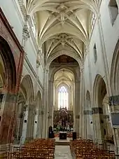 La nef est rebâtie entre 1548 et 1554, mais pas entièrement : manquent encore les voûtes des deux premières travées et sans doute le mur septentrional. Les archives de la fabrique ne sont plus complètes, mais aucun document ne témoigne d'autres travaux jusqu'au début des années 1570. Charles Terrasse suppose que les travaux s'interrompent ou qu'ils se concentrent uniquement sur le clocher, ce qui serait également plausible en tenant compte des actes conservés. L'élévation méridionale de la nef est stylistiquement très proche du bas-côté sud. Il est intéressant de remarquer que les piliers des grandes arcades ont d'abord été repris en sous-œuvre, comme déjà mentionné, alors que les murs hauts auraient été abattus quelques années plus tard seulement. Mais l'on voit que la fabrique passe un nouveau marché pour chaque étape de la reconstruction, ce qui est peut-être la clé de compréhension. En dépit de l'interruption des travaux qui se terminent vers 1572 pour la nef, toutes les voûtes sont homogènes. Ce sont des voûtes sur croisées d'ogives avec des liernes et tiercerons, formant le dessin dit en étoile à losange central. Pour Dominique Foussard, ces voûtes peuvent être considérées comme les éléments les plus remarquables de l'église[4],[9].